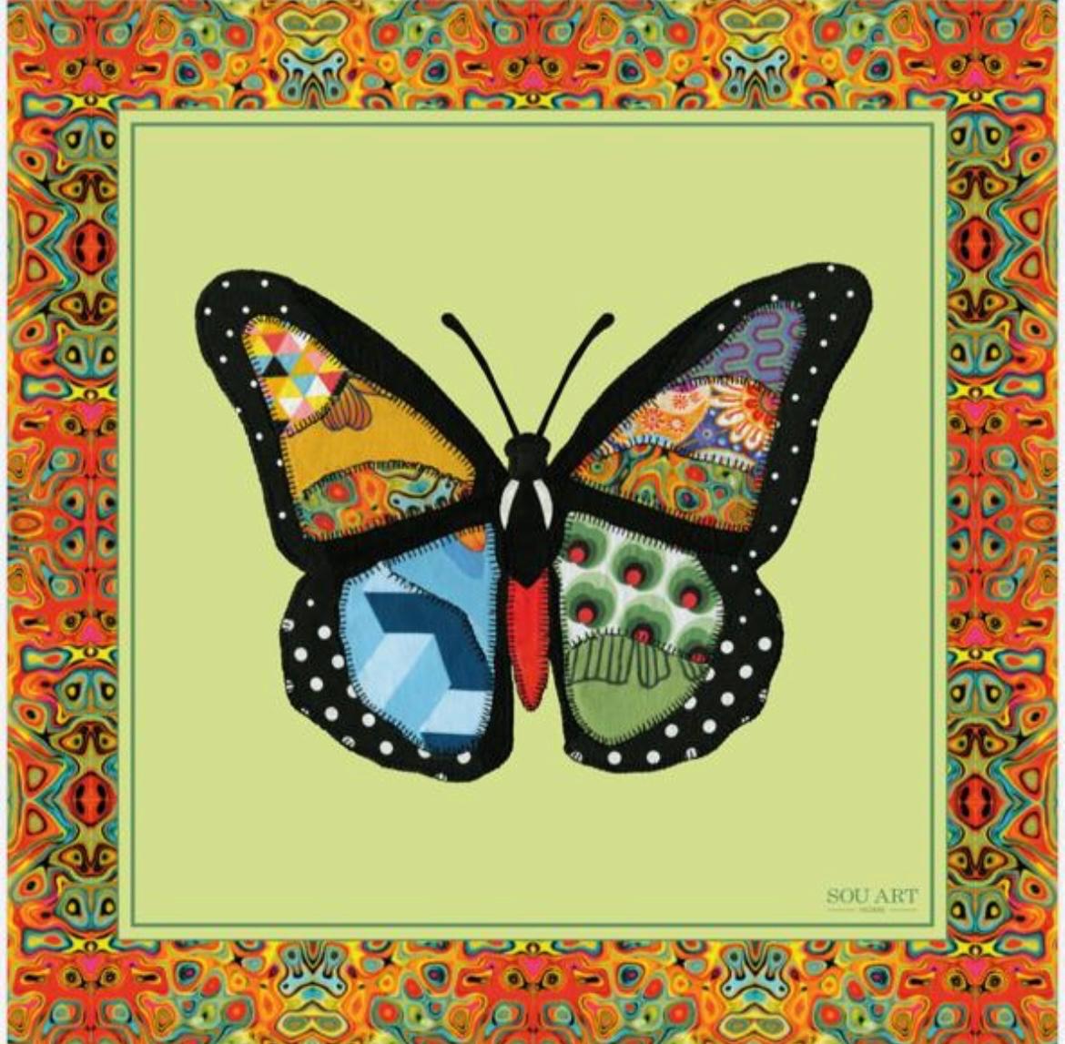 Sou seu lenço de seda, medindo 90 x 90cm, com estampa de uma Borboleta colorida, criada através da técnica quilt. Tenho toque leve, caimento elegante, e versatilidade para acompanhar você no dia a dia.