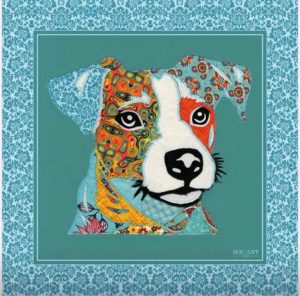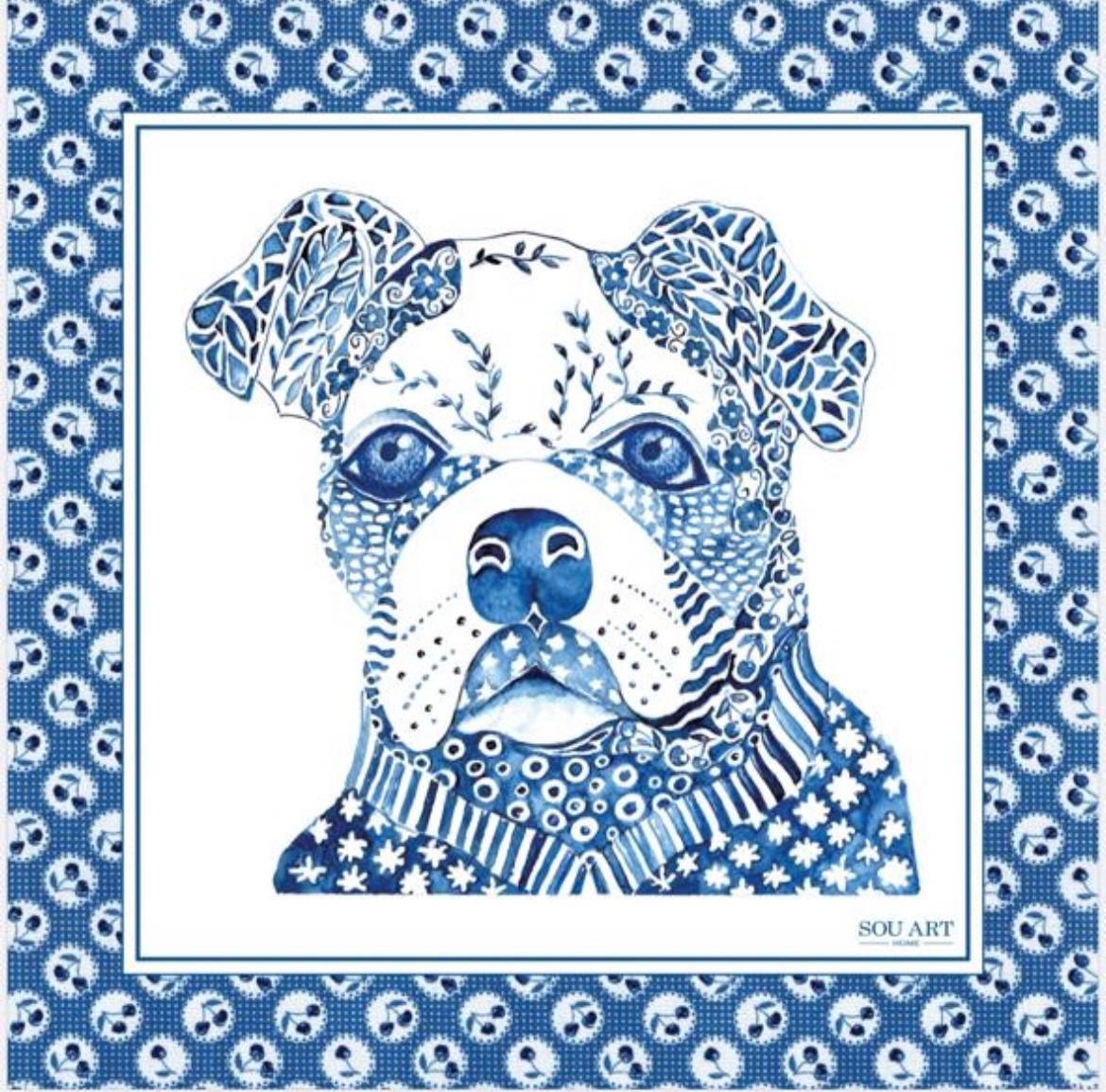 Sou seu Lenço de seda, medindo 90 x 90cm, com a arte de um Bulldog Azul, criada com técnica de aquarela. Nasci para envolver você com delicadeza, realçar a sua beleza e acompanhar seus momentos mais radiantes.