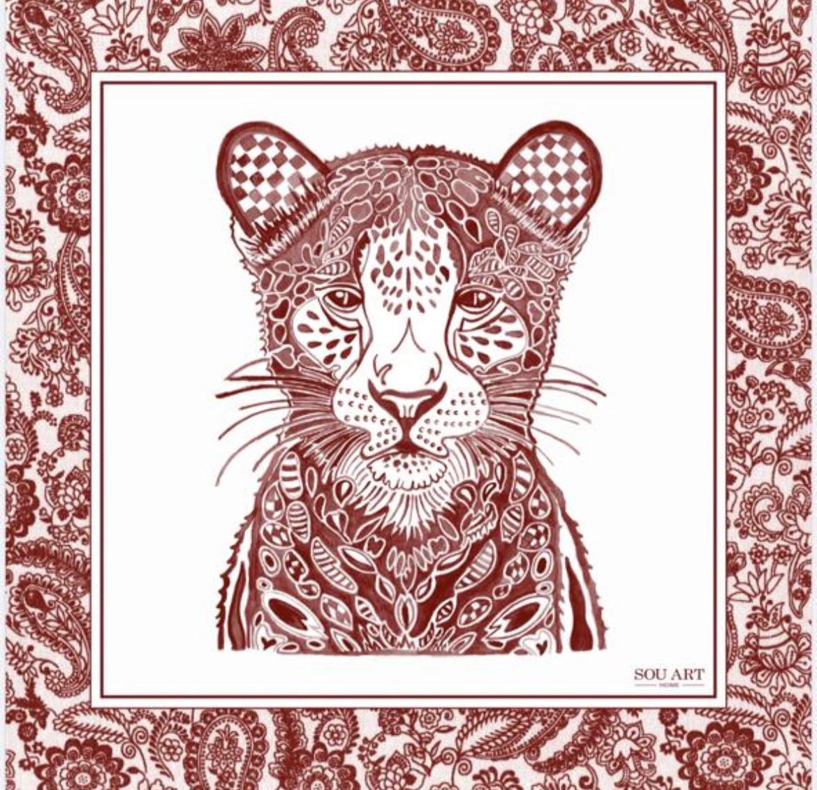 Sou seu Lenço de seda, medindo 90 x 90cm, com a arte de um Leopardo Marsala, criada com técnica de aquarela. Nasci para envolver você com delicadeza, realçar a sua beleza e acompanhar seus momentos mais radiantes.